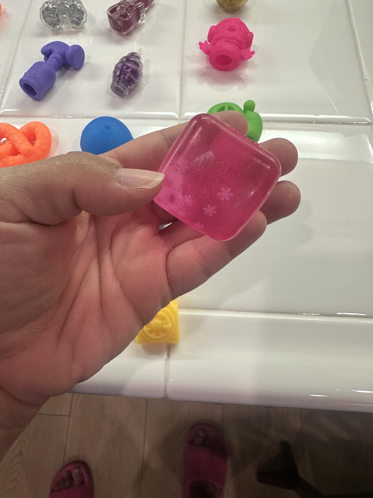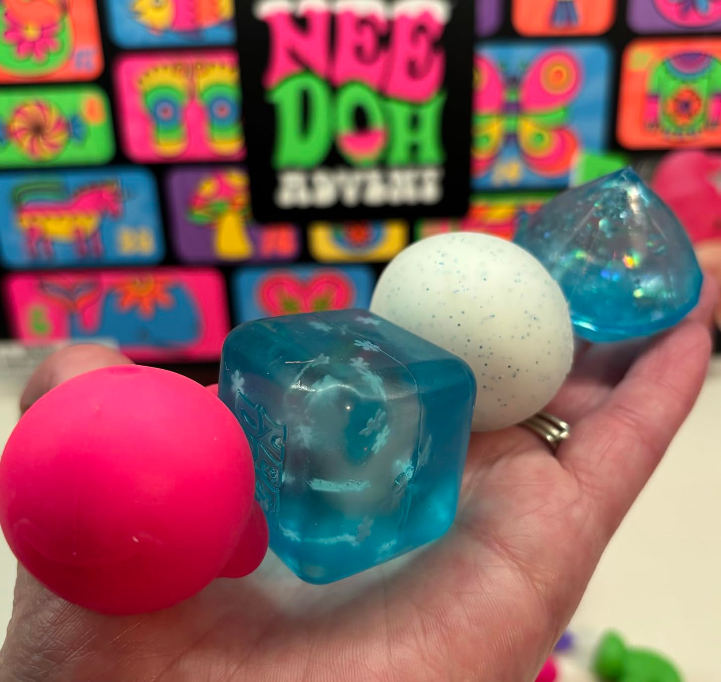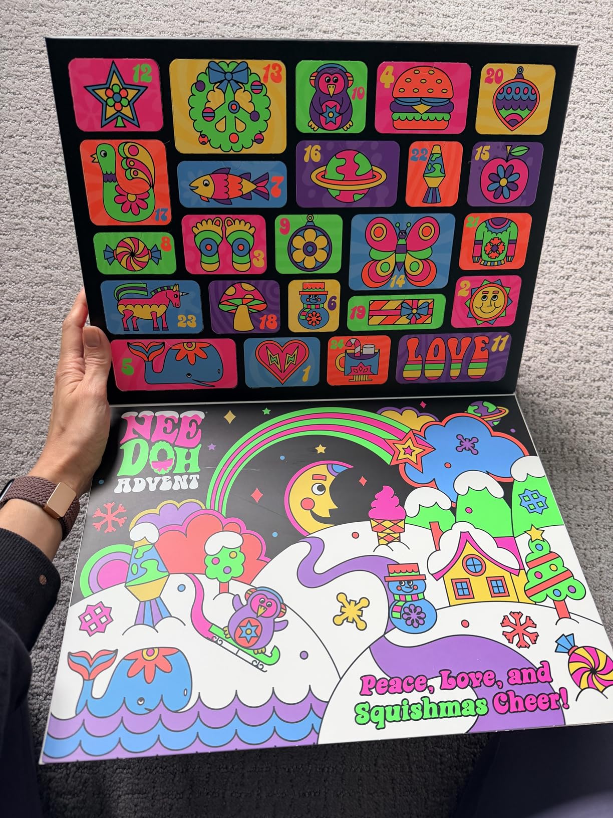 Each box includes 24 mini squishies, each with a unique color, texture, or festive shape — from trees and reindeer to sparkly candy and more!